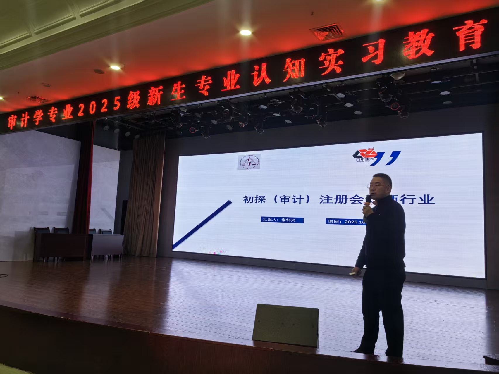 2025年10月27日下午六点,重庆财经学院会计学院会计审计系在学术报告厅成功举办了一场题为“初探(审计)注册会计师行业”的前沿讲座。本次讲座特邀重庆百年通冠会计师事务所(特殊普通合伙)高级会计师、注册会计师、房地产估价师秦怀兴担任主讲嘉宾,面向2025级审计1-2班及2023级专升本审计3-7班的同学,深入探讨了注册会计师行业的发展历程、现状与未来趋势。