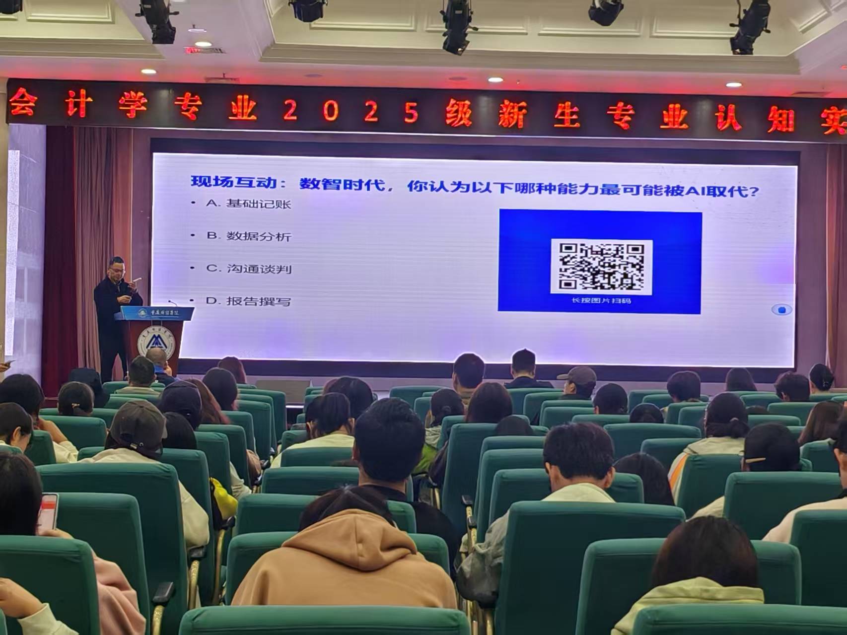 在互动问答环节,现场氛围热烈非凡。当被问及“哪些财会岗位最可能被 AI 取代” 时,超八成新生选择 “基础记账”;而在 “未来意向岗位” 调查中,“企业财务分析岗”“管理会计岗” 等需综合能力的岗位成为热门选择,充分展现出新生对行业趋势的敏锐洞察力。针对新生提出的 “如何平衡专业学习与技能提升”,谢江涛合伙人建议:“可从基础的 Excel 高级功能、SQL 入门学起,利用课余时间参与校企合作的实践项目,在实操中巩固知识。”