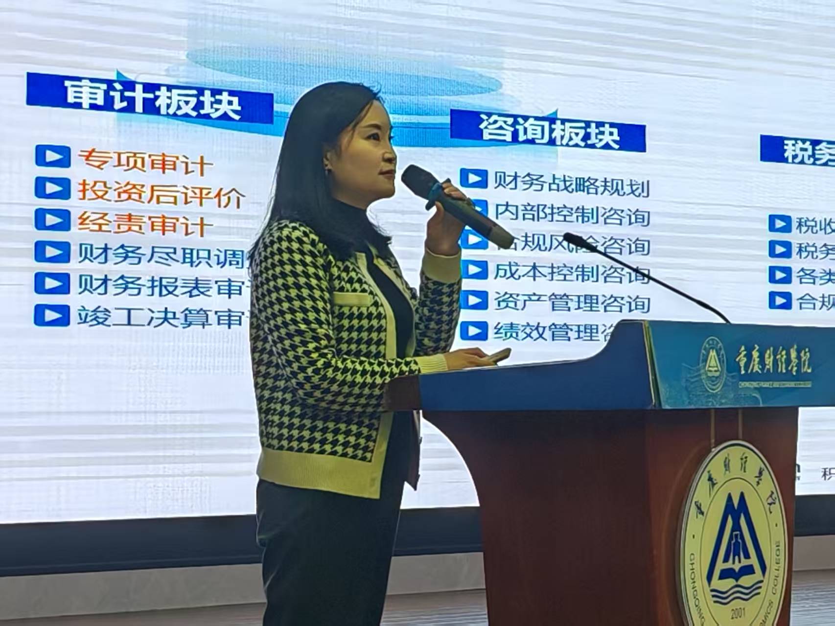 随后,淇澳同辉会计师事务所的业界专家带来前沿分享。樊馨远总监围绕“企业对财会人才的能力要求” 展开,详细介绍了事务所的业务布局、人才培养体系,特别强调 “具备 SQL 数据处理、智能财务系统操作能力的毕业生,在求职中更具优势”;谢江涛合伙人则以 “某上市公司财务数字化转型案例” 为引,生动揭示了 “AI 替代基础记账、财务人员转向战略分析” 的行业变革趋势,他提醒新生:“大学期间不仅要学好专业理论,更要多参与实践项目,培养解决实际问题的能力,才能在行业变革中站稳脚跟。”