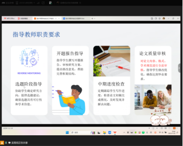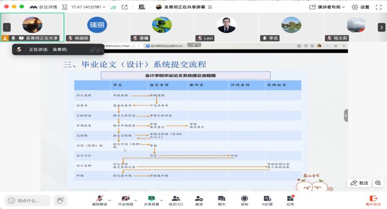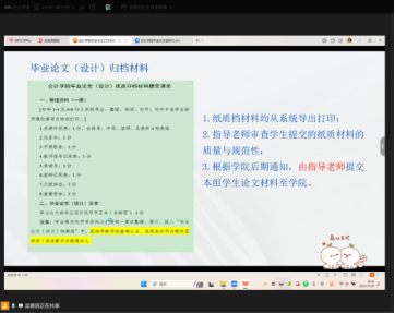 接着,会计学院教学秘书吴青玥老师从系统操作、过程指导、评阅答辩及归档材料和学术诚信四个板块来为各论文指导老师进行了介绍。在系统操作板块用图文展示具体操作流程及操作时注意事项,以便指导老师更快地熟悉系统。同时表示系统选题的确认、任务书的下达、文献综述和开题报告的审核、过程稿的指导、答辩稿的审定等各环节需严格遵循系统既定顺序推进。过程指导板块要求指导教师履行职责,在选题、开题报告、过程稿等方面进行指导、配合进行中期进度检查,完善后期工作,需及时掌控学生动态,了解学生论文完成进度。评阅和答辩板块则将学院的相关流程向各指导老师进行介绍,第四板块的材料归档和学术诚信则说明了本届论文归档材料内容及提交方式与往届的不同,强调了学术诚信的重要性。最后,王欢欢院长对参与毕业论文指导工作的老师表示感谢,同时也拜托各位指导老师严格要求学生,把控论文质量与规范,确保本届毕业论文工作顺利完成。