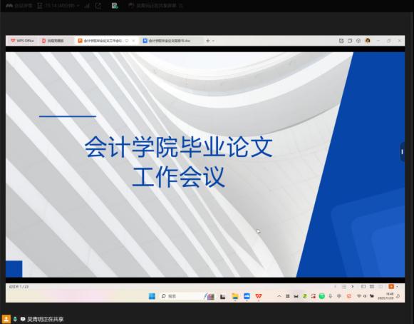 为切实推进会计学院2026 届毕业论文工作的开展,确保论文指导与管理各环节规范有序,保障毕业论文质量,2025 年 11 月 20 日晚,会计学院以线上会议形式召开毕业论文工作专题例会。会议由王欢欢副院长主持,各专业毕业论文指导老师参会。