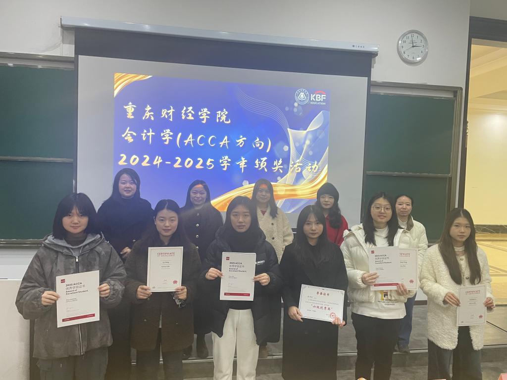 为表彰先进、激励ACCA学子,凝聚国际化财会人才培养的奋进力量,12月29日下午14:30,重庆财经学院2024 - 2025学年ACCA颁奖活动于教学楼1126阶梯教室隆重举行。会计学院副院长兼ACCA项目负责人鲍晓敏、会计学院教师李茉菡、各年级ACCA辅导员以及楷柏教育高校事业部重庆地区主管李春凤出席了此次活动,全体ACCA方向班学生共同见证了这一荣耀时刻。