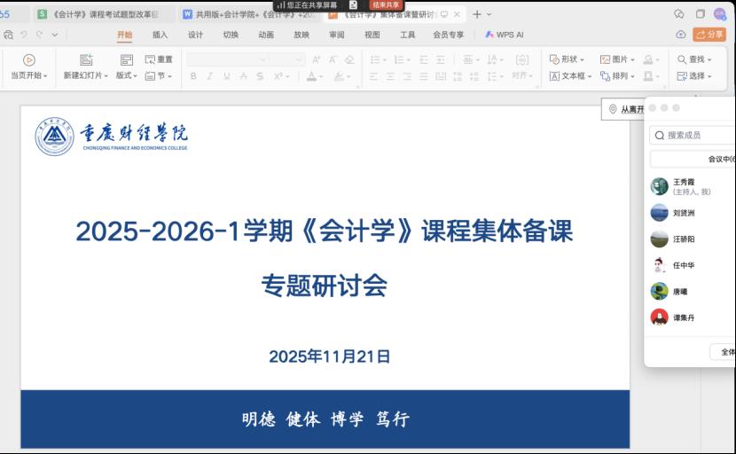 为优化课程教学质量、推进考试改革与AI教学融合,2025年11月21日,重庆财经学院2025-2026-1学期《会计学》课程集体备课专题研讨会顺利举行。课程负责人王秀霞老师主持会议,核心团队成员刘贤洲、汪骄阳及任课教师谭集丹、任中华、唐曦等共同参会,围绕三大核心议题展开深入研讨。