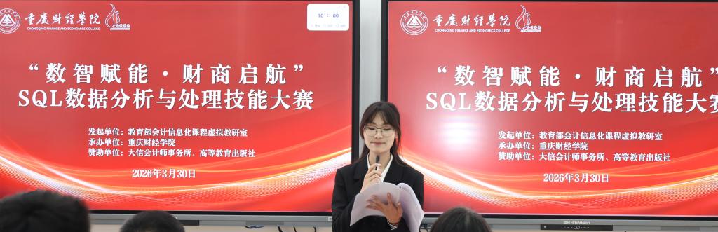 为落实立德树人根本任务,主动对接国家数字化发展战略,深化数智技术赋能会计教育教学改革,着力培养新时代复合型财会人才,2026年3月30日下午,重庆财经学院会计学院“数智赋能・财商启航”SQL数据分析与处理技能大赛决赛在教学楼智能会计实训室顺利举办。