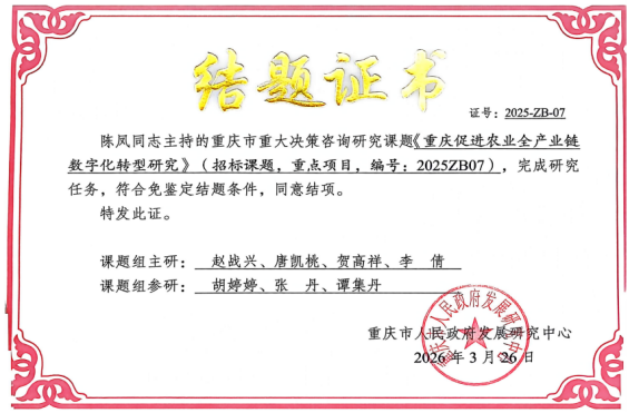 近日,接重庆市人民政府发展研究中心通知,由我校陈凤老师主持的重庆市重大决策咨询研究课题《重庆促进农业全产业链数字化转型研究》(招标课题,重点项目,编号:2025ZB07),已圆满完成研究任务,符合免鉴定结题条件,准予结项。