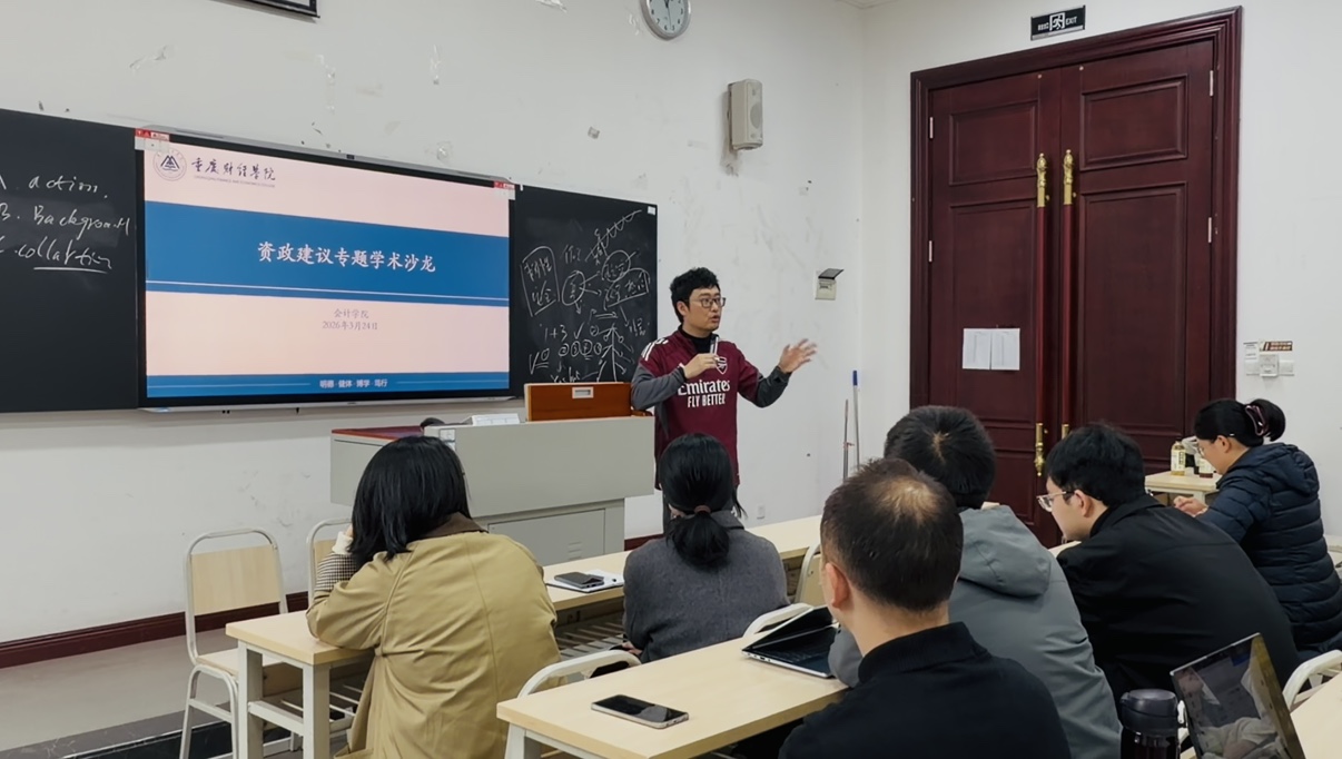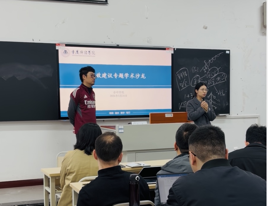 为进一步提升我院教师资政建言能力,推动学术研究与地方经济社会发展需求深度融合,2026年3月24日10点,我院于教学楼1402举办资政建议主题学术沙龙。本次沙龙特邀我校专任教师、巴南区政协委员刘小飞老师担任主讲嘉宾,学院主管院长、各系部教师参加活动,共同探讨资政建议的写作逻辑与实践路径。