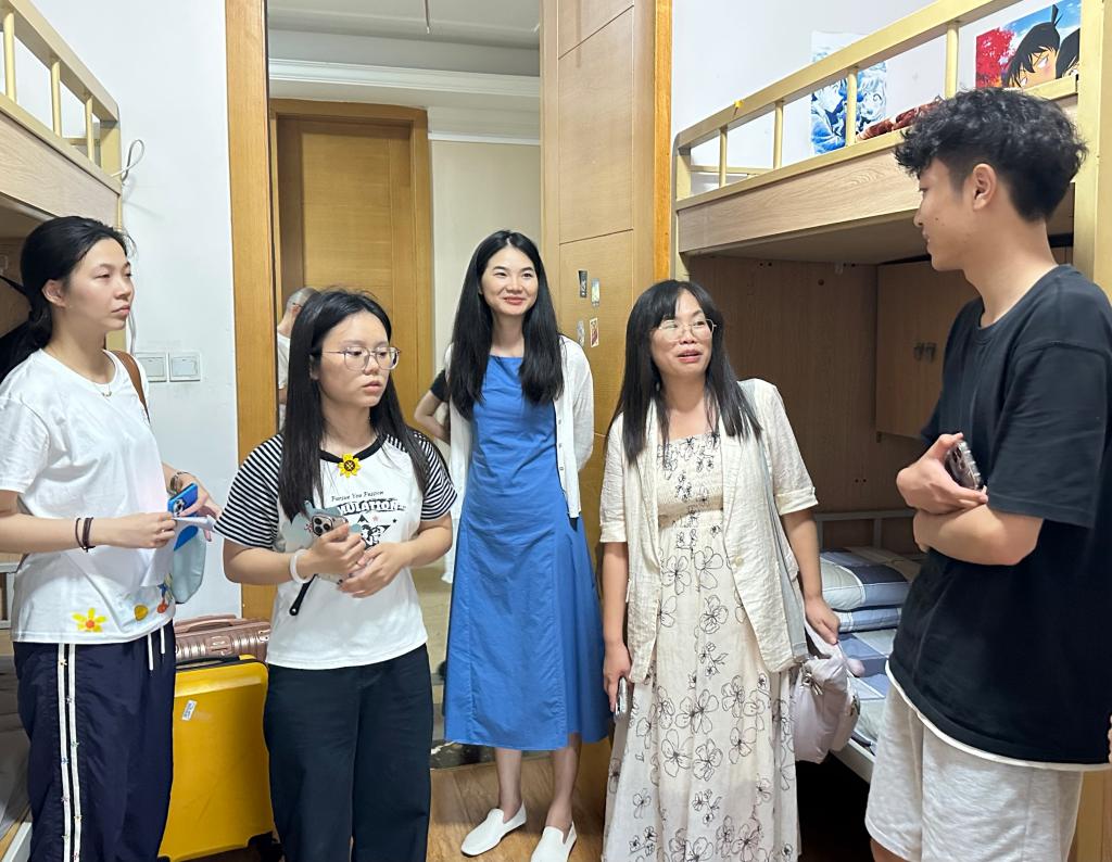 随后,党总支书记宋钰静、党总支副书记冉光波带队走访新生寝室,随行老师一同查看住宿环境,关切询问新生生活适应情况,细致叮嘱用电、财产等安全注意事项,现场协调解决新生遇到的行李收纳、网络连接等问题。走访中,师生亲切合影,老师们鼓励新生在新学期以奋斗姿态追逐梦想,书写青春篇章。