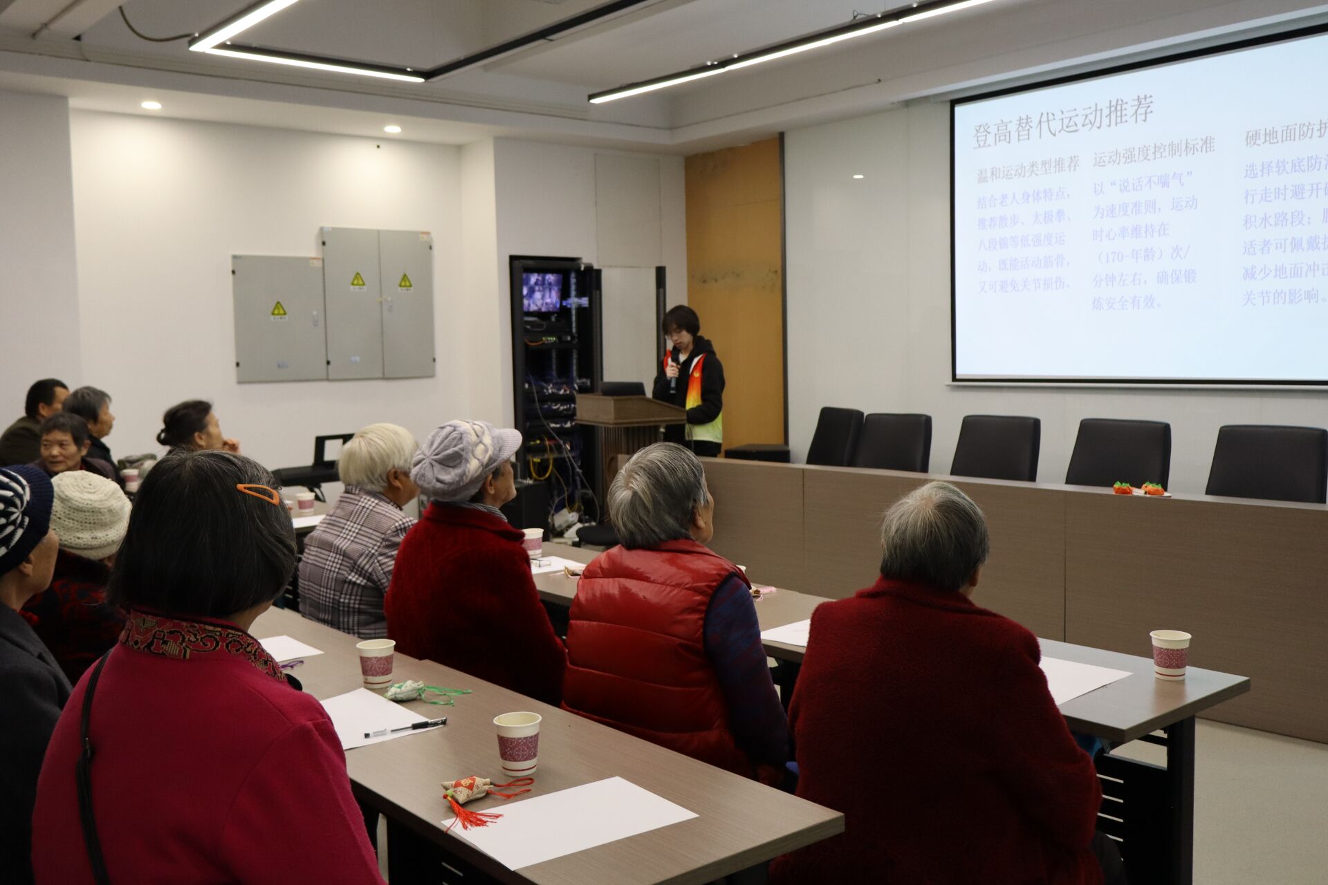 王涵、陆定怡等志愿者现场指导老人们制作茱萸香囊,从穿针引线的基础手法到香料填充的比例把控,志愿者一对一耐心示范,帮助老人完成专属香囊,以传统手作寄托健康祝愿;针对老人日常开销管理需求,志愿者结合会计专业所长,用通俗语言讲解“分类记录收支”“定期核对明细”等简单记账技巧,还为老人发放预制的记账表格,方便老人后续使用;畅诗妍、胡丹妮等4名志愿者则带领老人练习重阳拍拍操,根据老人身体状况调整动作幅度与节奏,重点设计肩颈、手腕、腿部的活动动作,确保老人在安全范围内活动筋骨。活动尾声,志愿者为每位老人赠送封装完好的菊花茶包,延续节日温暖。