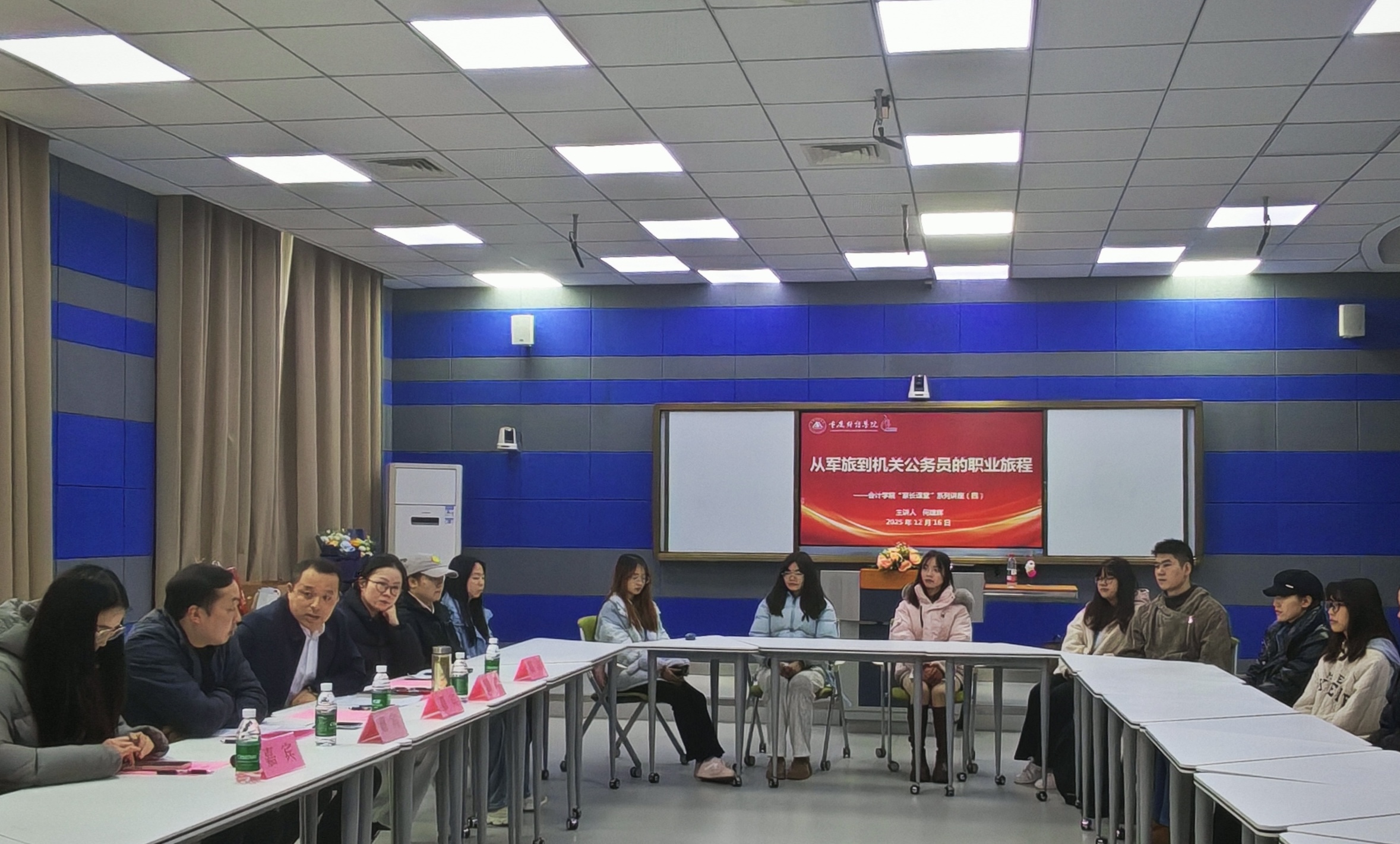为搭建家校协同育人桥梁,助力学生明确职业方向、塑造优良品格,12月16日,会计学院在教学楼1220智慧教室开展“从军旅到机关公务员的职业旅程”主题家长课堂,特邀重庆市巴南区市场监督管理局党组副书记何建辉担任主讲嘉宾。学院党总支副书记冉光波、学团办主任谭白冰、副主任陈晨及50余名学生代表参与。