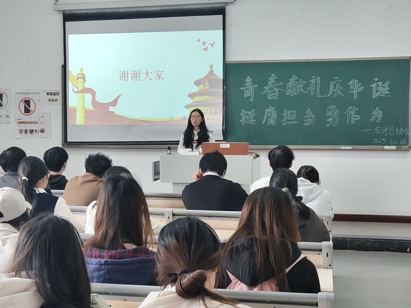 为引导团员深刻理解青年与国家发展的紧密联系,明确新时代挺膺担当的方向与团员责任义务,2025年10月23日,会计总协会于教学楼1521教室举办以“青春献礼庆华诞,挺膺担当勇作为”为主题的团日活动。本次活动由会计总协会审计分协会会长金弋莎主讲,出席本次活动的有会计总协会会计分协会指导老师谭集丹以及会计总协会全体成员。