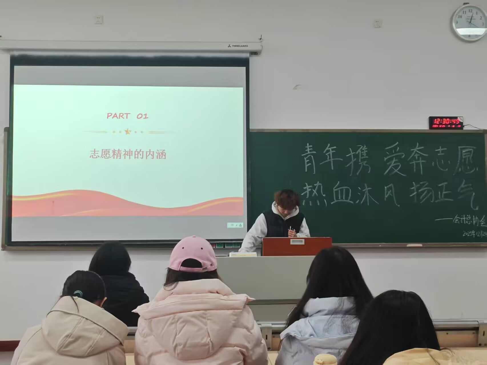 为弘扬志愿精神,引导团员青年以实际行动践行社会责任,在奉献中彰显青春担当,2025年12月24日,会计总协会于教学楼1507教室成功举办以“青年携爱奔志愿,热血沐风扬正气”为主题的团日活动。本次活动由会计总协会会计分协会副会长张云泉主讲,会计审计系主任陈宇虹老师及会计总协会全体成员共同参与。