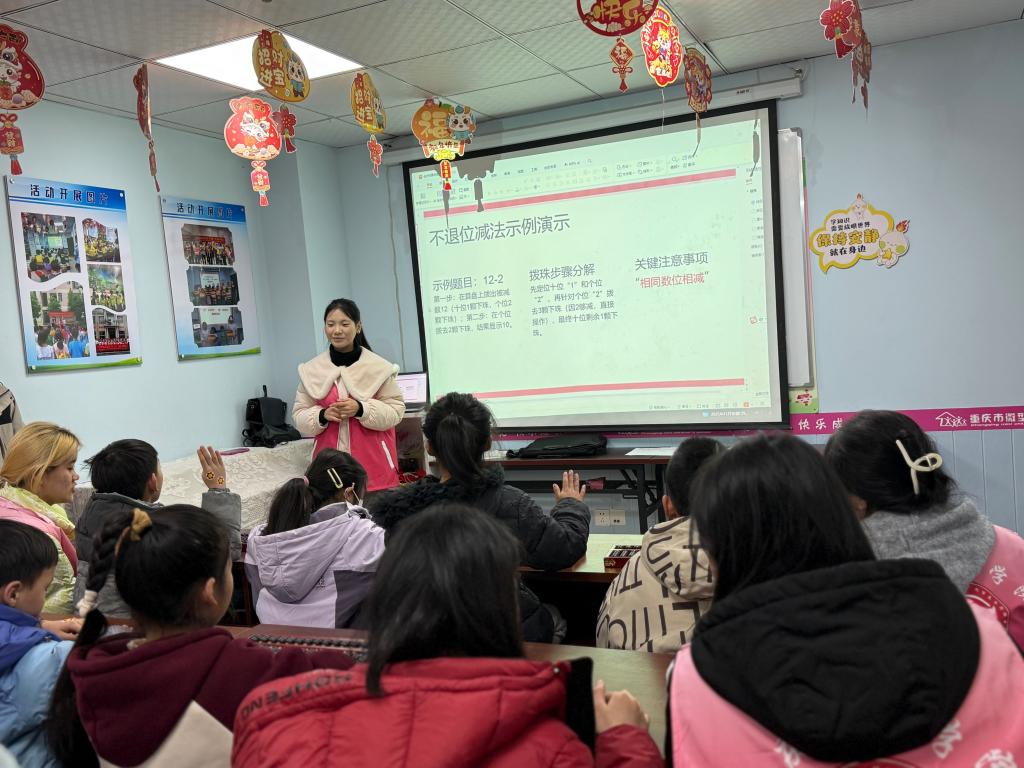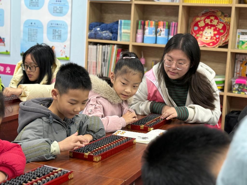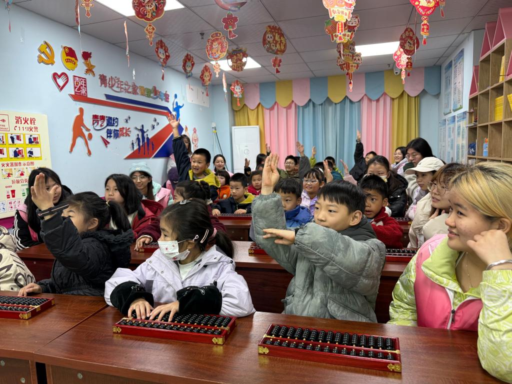 尽管课程难度较于首期明显提升,但孩子们的学习热情丝毫未减。他们眼中闪烁着求知的光彩,偶尔的“慢半拍”与“小迷糊”反倒成了课堂的趣味插曲,拉近了志愿者与孩子们的距离。最后“你出题,我来拨”的互动环节,更让孩子们化身“小老师”,现场气氛融洽而活跃。在妙趣横生的教学相长中,传统文化的种子与奉献互助的精神悄然传递。