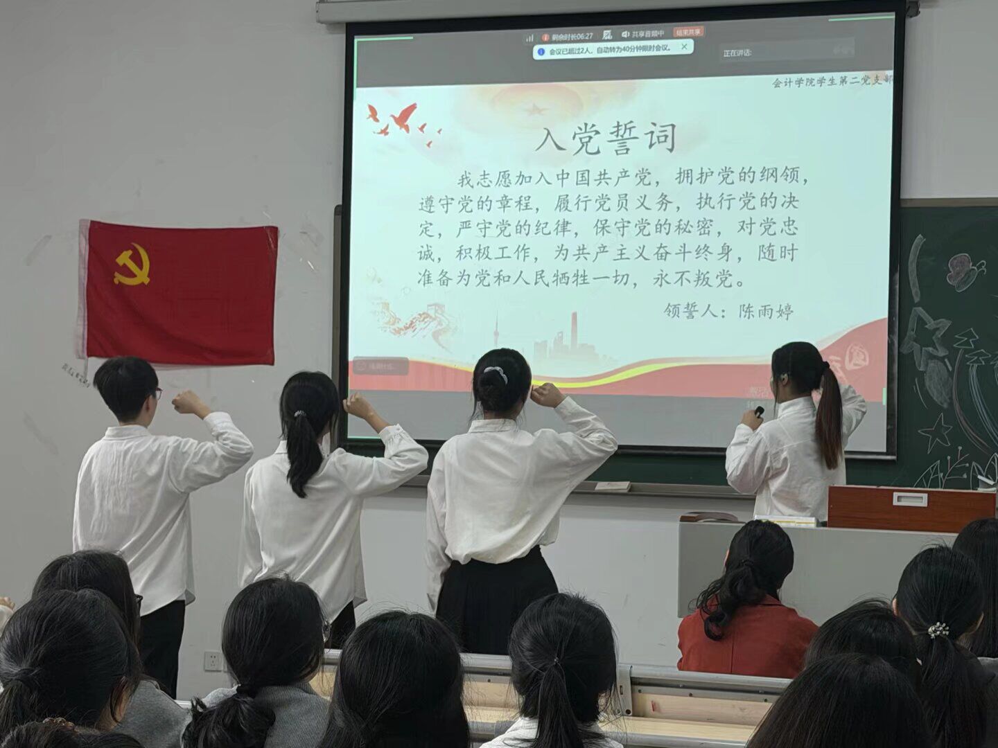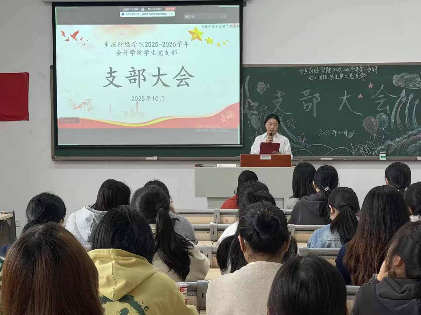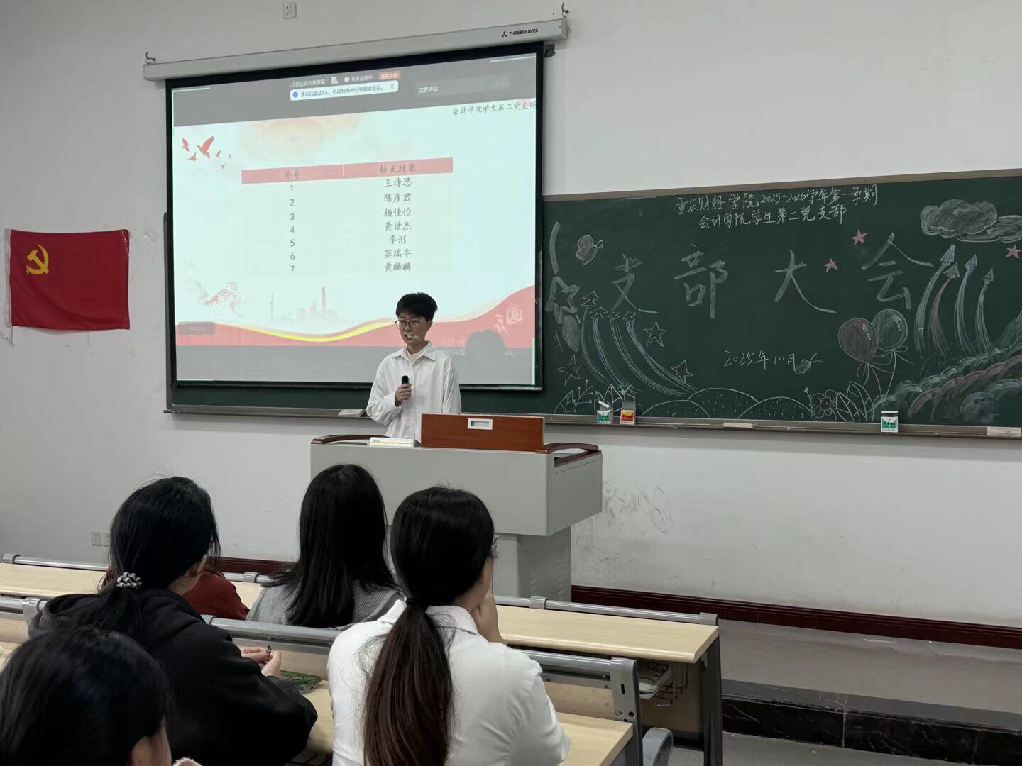 为扎实推进基层党组织标准化、规范化建设,严格落实党员发展程序,持续强化学生党员思想政治教育,2025年10月30日,重庆财经学院会计学院学生第二党支部于教学楼1505教室召开2025—2026学年第一学期十月支部大会。本次大会以预备党员转正为主要议题,通过规范流程、严明标准、凝聚共识,进一步锤炼党员队伍,筑牢思想信仰根基,夯实党支部战斗堡垒。