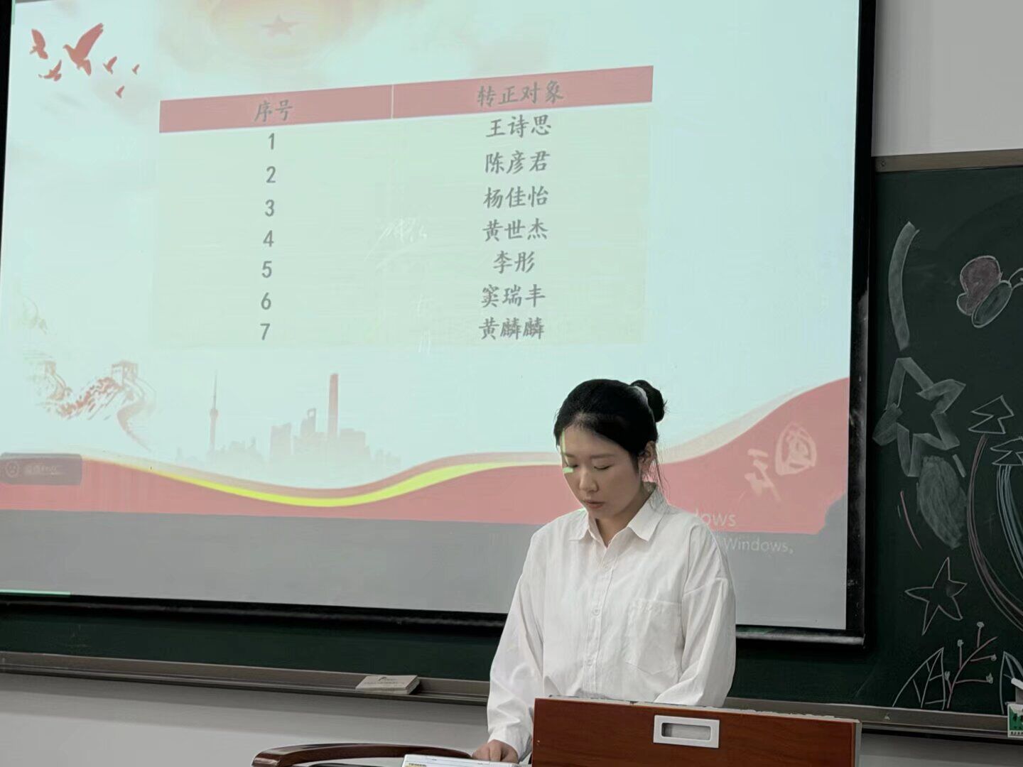 王诗思、陈彦君、杨嘉怡、黄世杰、黄麒麟、窦瑞丰、李彤七名预备党员依次汇报预备期表现,围绕政治理论学习、专业提升、履职担当与社会实践等方面,系统梳理个人成长与思想进步。入党介绍人依次汇报培养考察情况,对各预备党员在思想政治素养、组织纪律观念及日常表现等方面进行全面评价,并明确提出同意按期转正的意见。