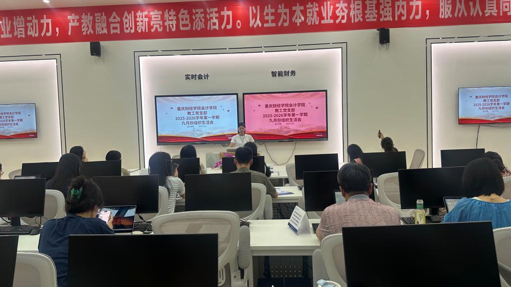 2025年9月22日中午11:00,重庆财经学院会计学院教工党支部于1206顺利召开2025-2026学年第一学期九月份组织生活会。本次会议以“传承伟大抗战精神、深化作风建设”为核心主题,将学习贯彻习近平总书记重要指示精神、中央政策文件与高校教育教学实践紧密结合,通过理论领学、专题研讨的形式,构建党员政治素养与育人能力双提升的学习机制,为学校高质量发展筑牢思想根基与制度保障。