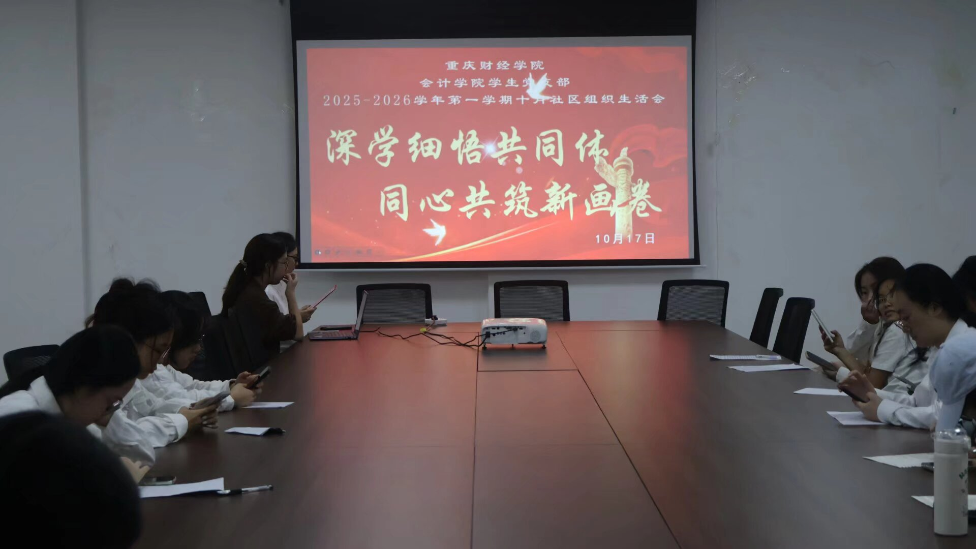 10月17日中午,为深化党员对中华民族共同体意识的理解与认同,会计学院党支部在G1-109教室举办了“深学细悟共同体,同心共筑新画卷”社区组织生活会。会计学院全体学生党员以及党员服务站工作人员出席了本次会议,会议由张珈嘉同志主持。