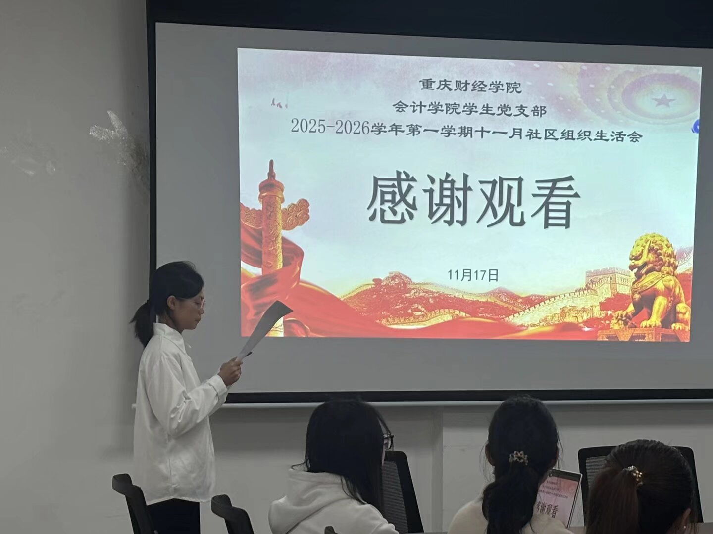 2025年11月17日,重庆财经学院会计学院学生党支部于G1-109会议室召开“锤炼求真务实作风,奋力推动开创新局”组织生活会。会计学院部分学生党员、预备党员及党员服务站骨干成员齐聚一堂,共学务实精神、共话使命担当。会议由学生党员张珈嘉同学主持。