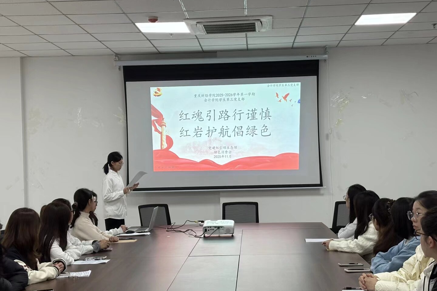 为引导师生党员赓续红色血脉、践行绿色理念,以实际行动助力校园生态文明建设,11月21日,会计学院学生第三党支部在G1—109党团活动室组织开展“红岩护航倡绿色”特色系列活动之绿色消费学习活动。本次活动以党建引领生态教育,融合红岩精神价值取向与绿色消费理念,推动党建与生态文明建设深度融合。