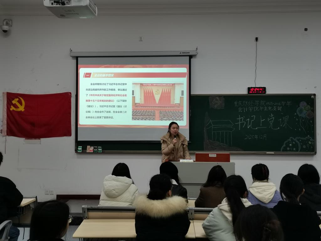 为学习贯彻党的二十届四中全会精神,进一步强化学生党员的作风建设与责任担当,12月15日,重庆财经学院会计学院学生第一党支部在1318教室开展了学习贯彻党的二十届四中全会精神专题党课。党课由支部书记黄洁主讲,全体党员参会学习,共同深入领会全会精神的核心要义与实践要求,推动全会精神在学生党员群体中落地生根。