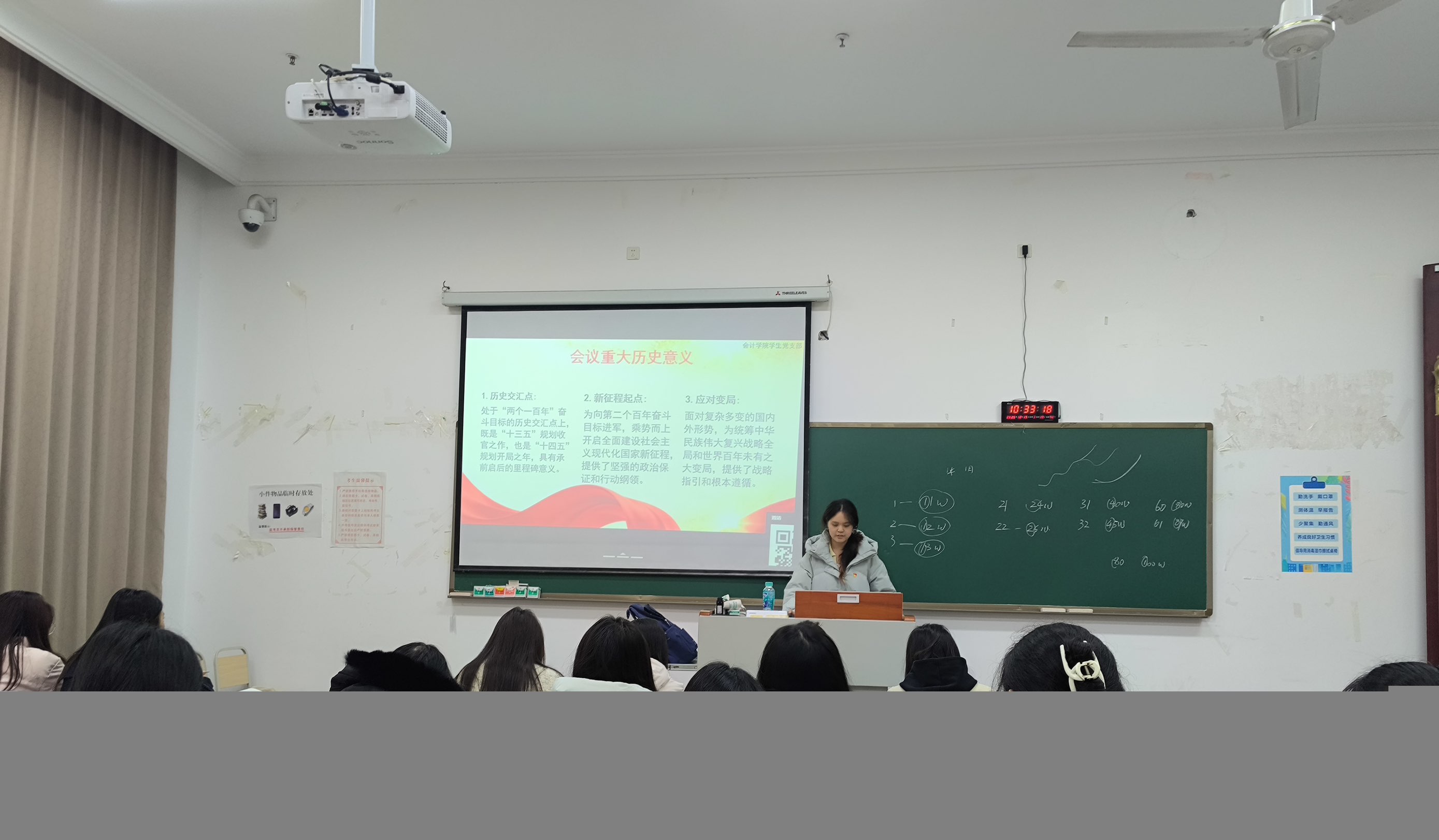 在对“十四五”规划建议的解读中,在25会计六班的宣讲中,秦梦缘同志系统阐述了以习近平新时代中国特色社会主义思想为指导、贯彻新发展理念、以高质量发展为主题的指导思想,并围绕创新驱动、科技自立自强、深化改革、人民至上、共同富裕、绿色转型等关键任务展开说明,帮助新生明晰国家未来五年的战略布局与2035年远景目标。在25审计一班的宣讲中,李月同志在宣讲时特别提到:“全会强调的‘高质量发展’与我们会计专业紧密相关,如今数字经济赋能财务转型,我们学好财务数据分析、智能审计等知识,就是在为企业合规经营、社会经济高质量发展筑牢专业根基。”