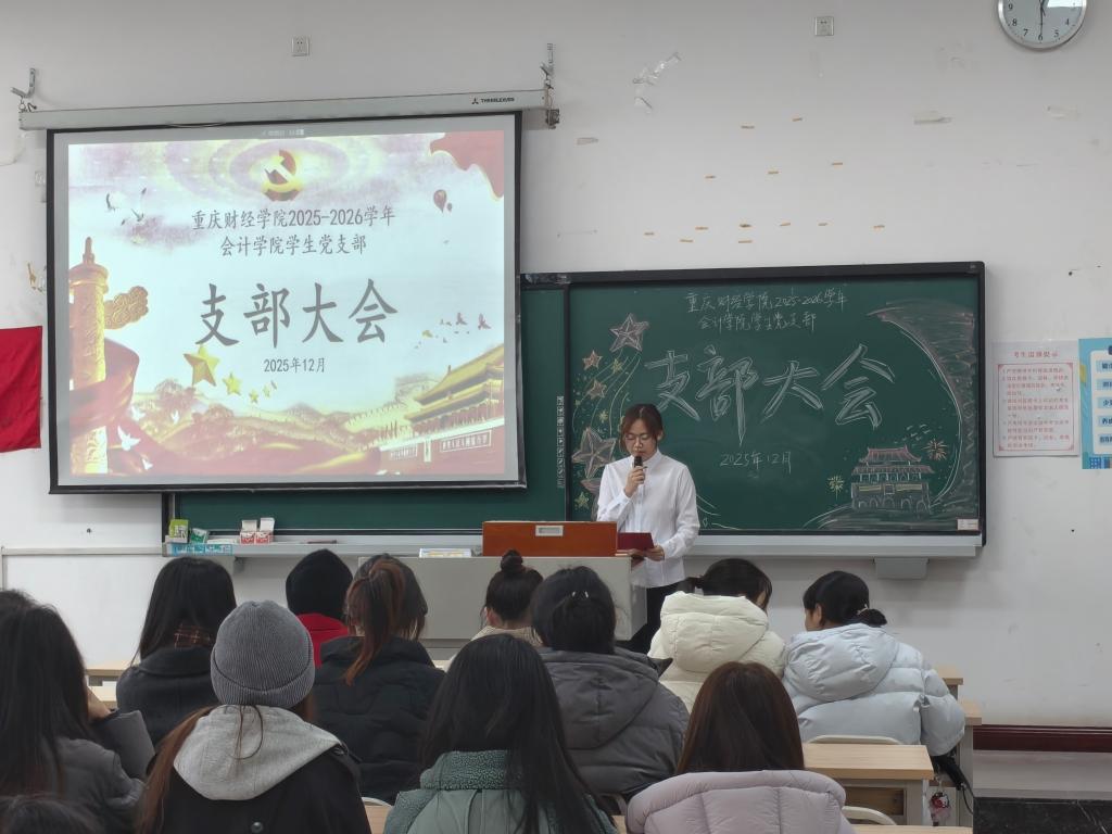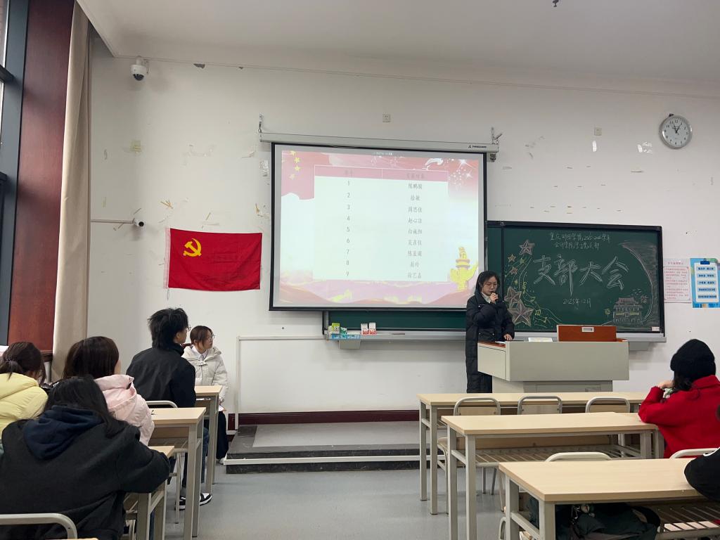 12月29日,重庆财经学院会计学院学生党支部在教学楼1312教室顺利开展了十二月支部大会,会计学院学生第一党支部书记黄洁、学生第二党支部书记谢雨贝、学生第三党支部书记黄娟、全体党员和预备党员出席了本次会议,会议由屈佩憬同学主持。