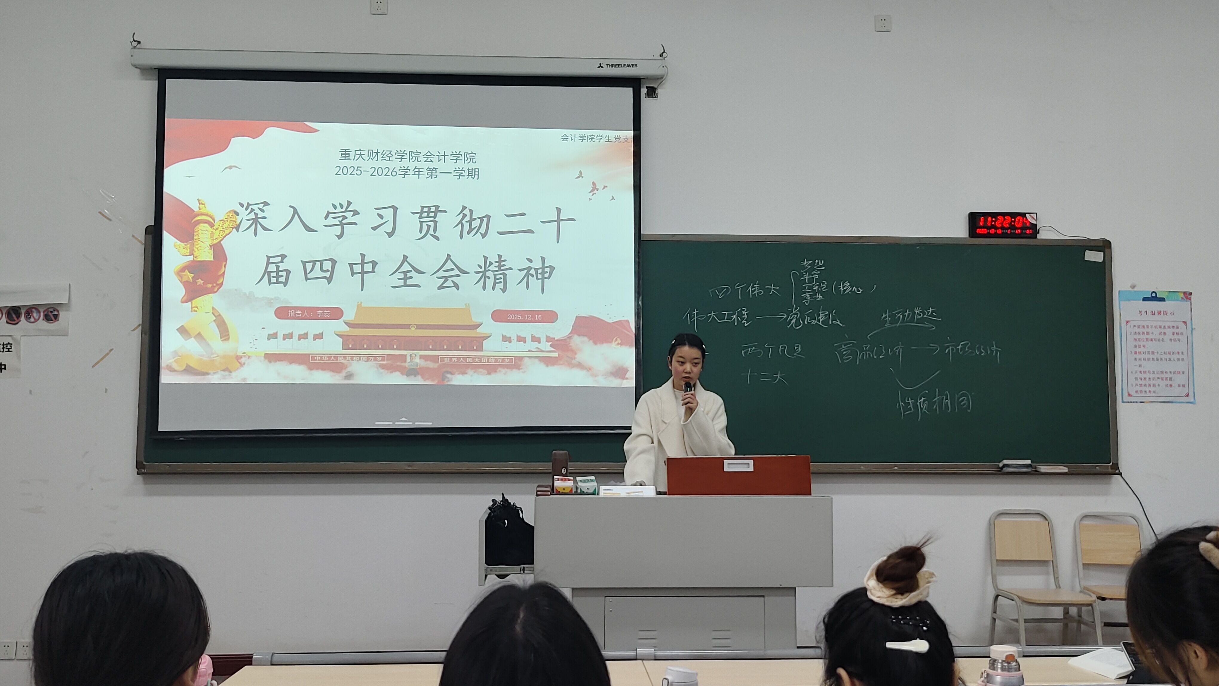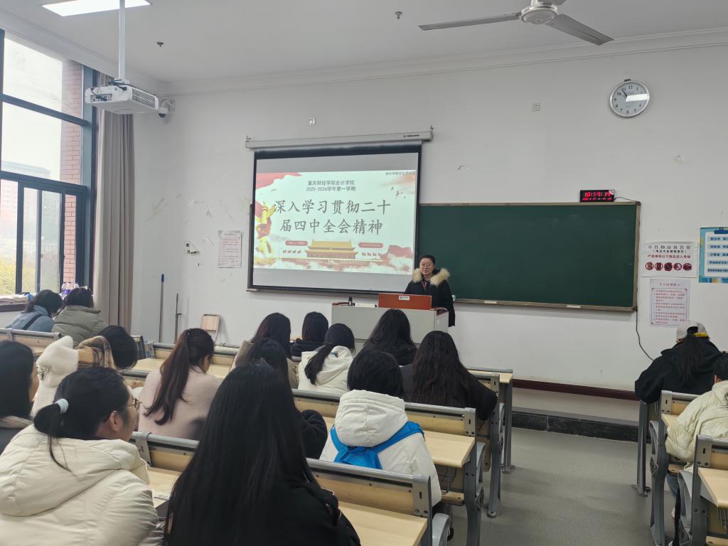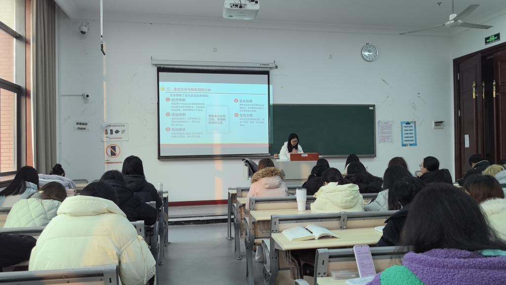 宣讲围绕二十届四中全会的历史方位、核心主题、阶段性目标、战略路径与实践举措等五个方面展开。在24会计六班的宣讲中,慕丽坪同志从全会的意义入手,剖析国家治理现代化进程中的机遇与方向。随后,结合经济体制、政治体制、法治建设、社会治理、生态文明关键领域,系统阐释制度创新的方向与重点,并通过“科技赋能治理”“强化制度执行力”等关键举措,生动展现制度优势转化为治理效能的实践逻辑。