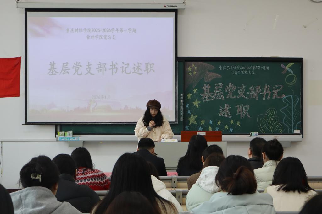 为深入推进全面从严治党走深走实,切实提升基层党建工作质量,进一步明确党支部书记的职责使命。2026年1月13日下午13时,会计学院学生第二党支部于教学楼1305教室组织召开2025-2026学年第一学期基层党支部书记述职会。重庆财经学院副校长李春雷、会计学院党总支书记宋钰静、党总支副书记冉光波、专职组织委员陈晨、学生第二党支部书记谢雨贝以及支部全体学生党员、预备党员共同参会。