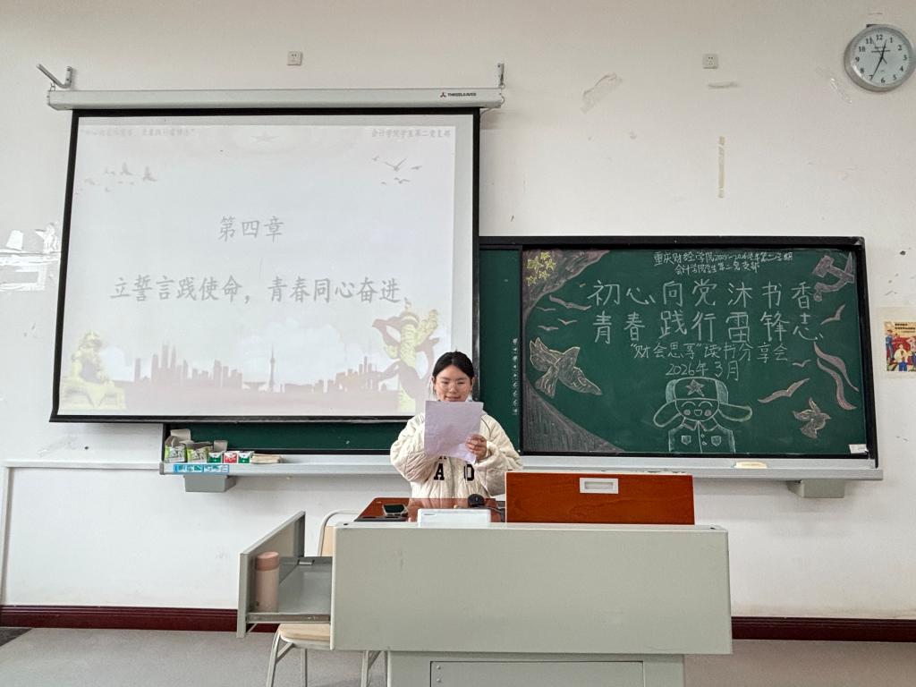 为深入挖掘雷锋精神的时代内涵,引导支部师生在红色阅读中感悟初心、传承薪火,以青春之力践行雷锋精神、勇担时代使命,3月16日,重庆财经学院会计学院学生第二党支部在1313教室开展“初心向党沐书香,青春践行雷锋志”主题读书分享会,支部全体师生参与本次活动。