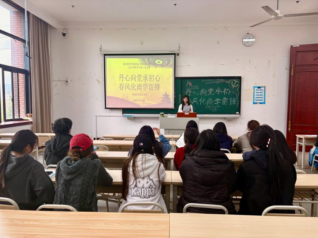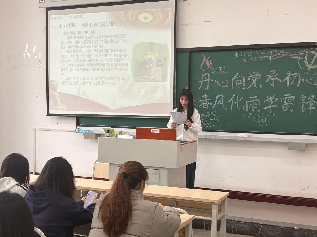 为积极响应国家“双碳”战略号召,推动雷锋精神与绿色消费理念在新时代青年中深度融合,3月16日中午,重庆财经学院会计学院学生第三党支部在教学楼1314教室,成功举办“丹心向党承初心,春风化雨学雷锋”绿色消费会。会计学院学生第三党支部第一党小组全体成员参与活动,会议由黄一菲同学主持。