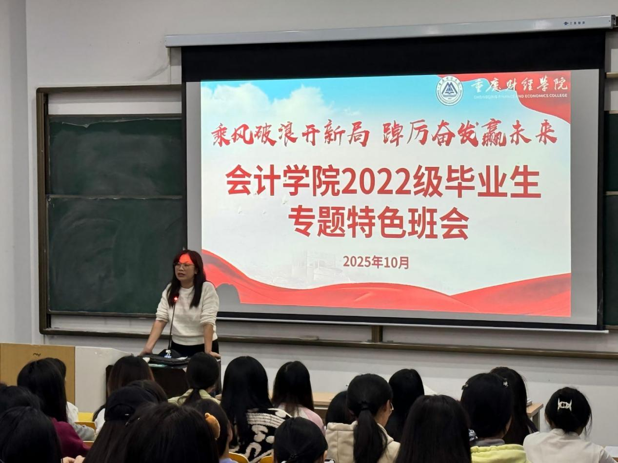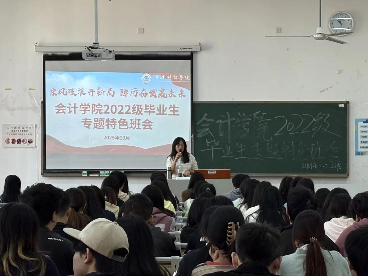 为切实引导2026届毕业生树立科学就业观念、系统提升求职竞争力、全面强化安全防范意识,会计学院于2025年10月在学校教学楼集中组织开展毕业生专题特色班会。本次班会由学院党总支书记宋钰静担任主讲人,教研室主任结合专业特色开展指导,全体毕业班辅导员会后进行一对一简历指导。本次活动覆盖学院24个毕业班、1140名毕业生,分批次有序开展10场专题会议。会议聚焦简历优化指导、就业观念塑造、就业政策解读三大核心板块,通过“学工团队+教工团队”联动协作模式,为毕业生搭建全方位就业服务平台,助力学子们在毕业季顺利启航,奔赴职业新征程。