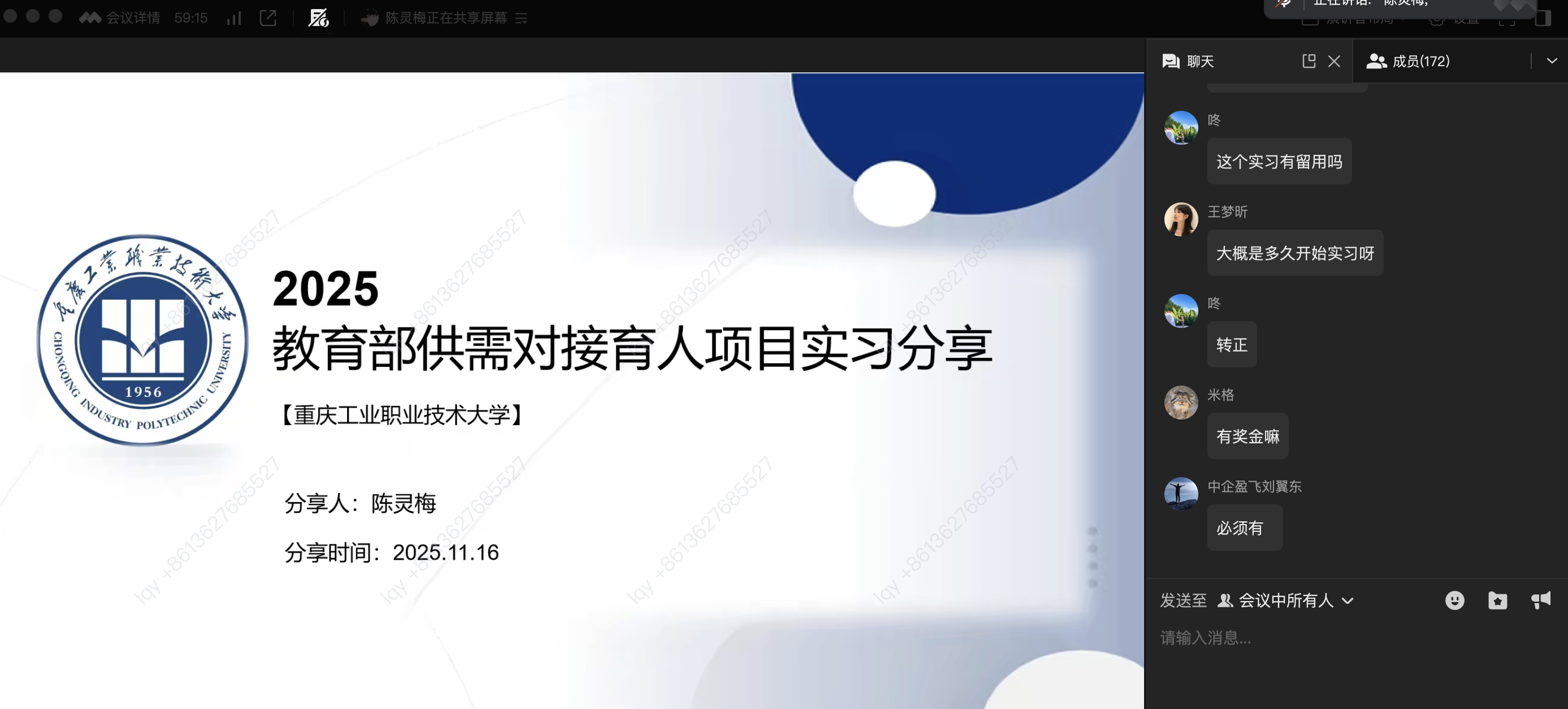 随后,重庆工业职业技术大学陈灵梅同学分享了参与教育部供需对接项目实习的感受。从心理上如何适应从学生到上班族的转换,学习工作能力的提升等方面做了案例分享。