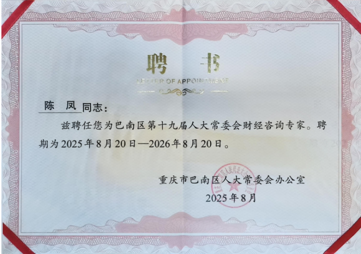 图1巴南区第十九届人大常委会财经咨询专家证书