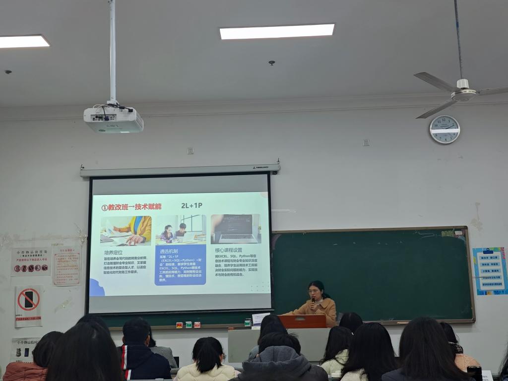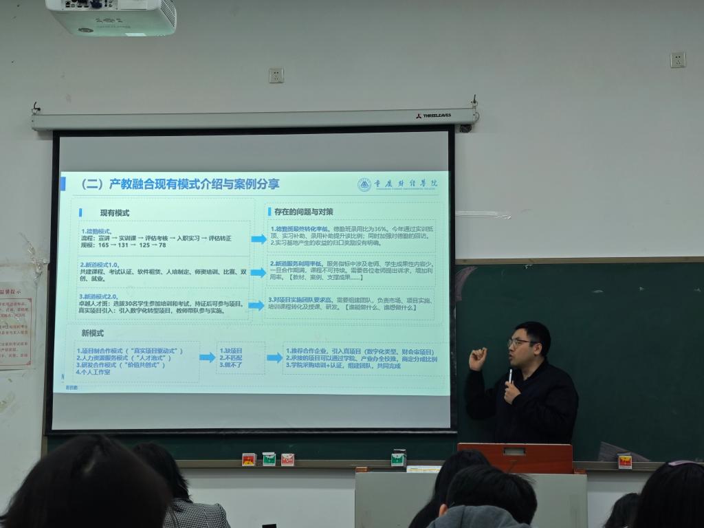 随后,鲍晓敏院长就会计学院师资团队分流发展计划进行详细解读,正式推出教师“三赛道” 自主发展模式,包括技术赋能型、产教融合型及个性化发展型,教职工可结合自身专业特长与职业发展规划自主选择赛道。其中,产教融合赛道作为重点推广方向,学院将联合用友、金蝶等行业头部企业,以及知名会计师事务所、专业咨询机构等,引入真实商业项目,由教师带队指导学生完成项目全流程实施与交付。为保障赛道落地见效,学院将为相关教师提供专项培训与职业认证支持,明确项目推进遵循企业周期安排,鼓励教师在真实项目实践中锤炼专业能力、积累行业经验。技术赋能赛道聚焦 “技术+会计” 深度融合,重点围绕毕业设计数字化指导、数字化课程开发与建设等工作,推动教学创新与技术应用协同发展。此外,鲍晓敏院长表示,学院将进一步拓展校企合作的广度与深度,加大与会计师事务所、税务所、代账公司等机构的合作力度,重点推进大四集中实习项目,力争为学生提供更充足、更高质量的实习岗位资源,全面满足学生实践成长需求。